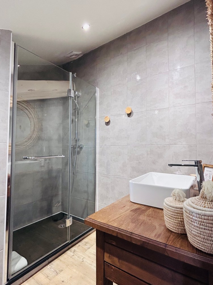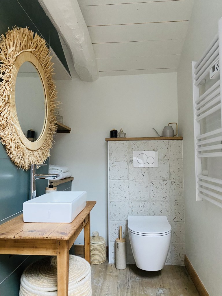 Leur salle de bain privée, aux couleurs chaleureuses, sont équipées d’une grande douche confortable, d’un toilette, d’un meuble vasque et d’un miroir qui ont été chinés aux détours de balades dans le Pays Basque.